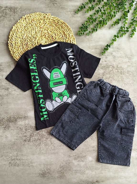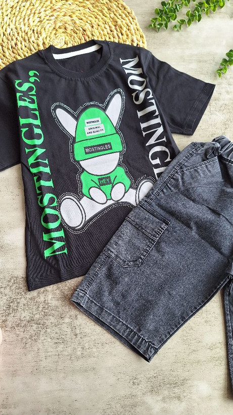 ست تیشرت شلوارک پسرونه سگ عینکی نگینی جنس شلوارک:جین کاغذی